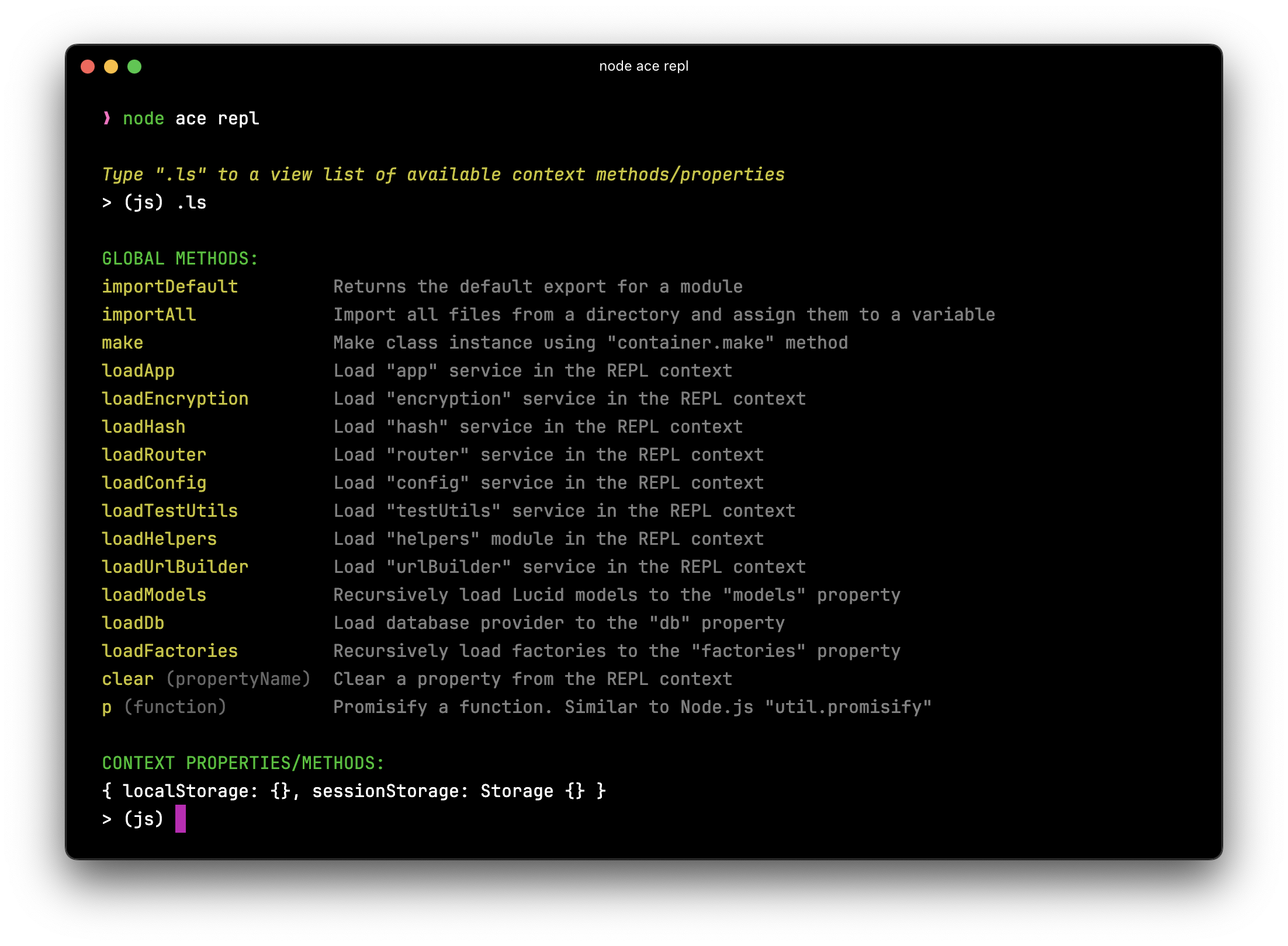 You can start the REPL session using the node ace repl command. This boots your AdonisJS application and opens an interactive prompt where you can execute code.