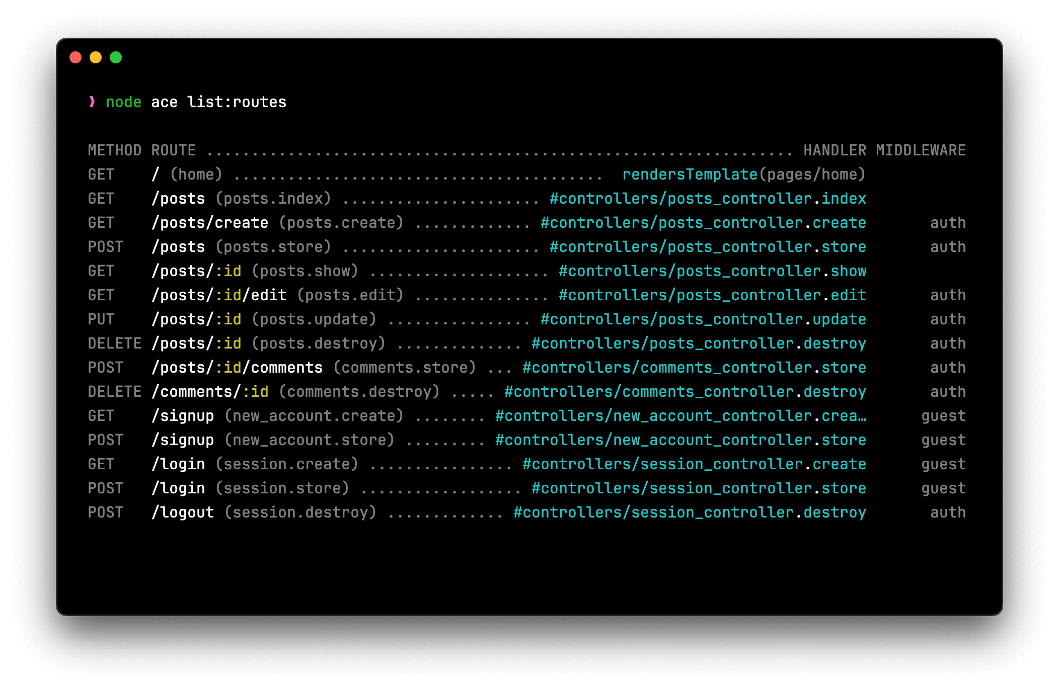 You can view all routes registered by your application using the Ace CLI command below. This is helpful for debugging, verifying route names, or checking which middleware is attached to specific routes.